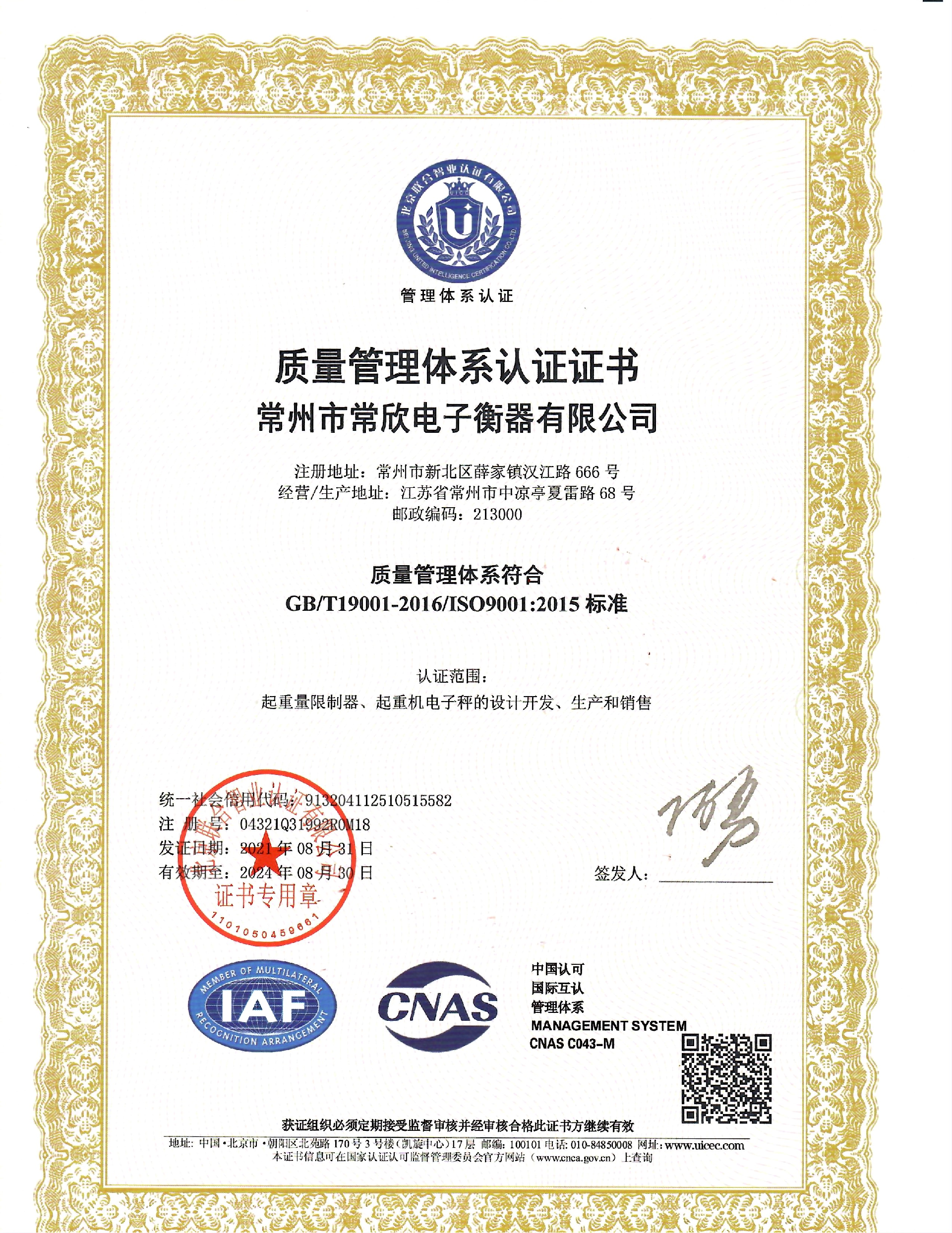 1998年12月,常欣公司率先在同行業(yè)中通過了IS09001質(zhì)量體系的認(rèn)證。2008年被確認(rèn)為全國(guó)起重機(jī)械標(biāo)準(zhǔn)化技術(shù)委員會(huì)委員,參與制訂